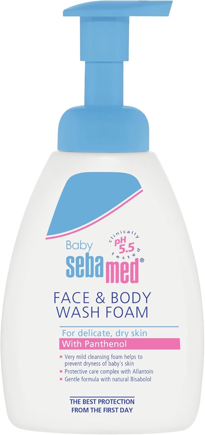 Make bath time fun and without tears with the Sebamed 400ml Face And Body Wash Foam. Consolidates the resistance of baby’s delicate skin. With the pH value of 5.5 Baby Sebamed is clinically proven to promote the development of the acid mantle Without color additives 100 soap and alkali-free smooth, extra mild foam for the most gentle and convenient daily cleansing of your baby’s delicate skin. Protective moisturizing complex with moisture-retaining allantoin and bisabolol. Effective hydration prevents dryness Panthenol protects against irritation on babies face and body. Panthenol and Allantoin contribute to the soothing and regenerating effects Easy to apply and rinse off.